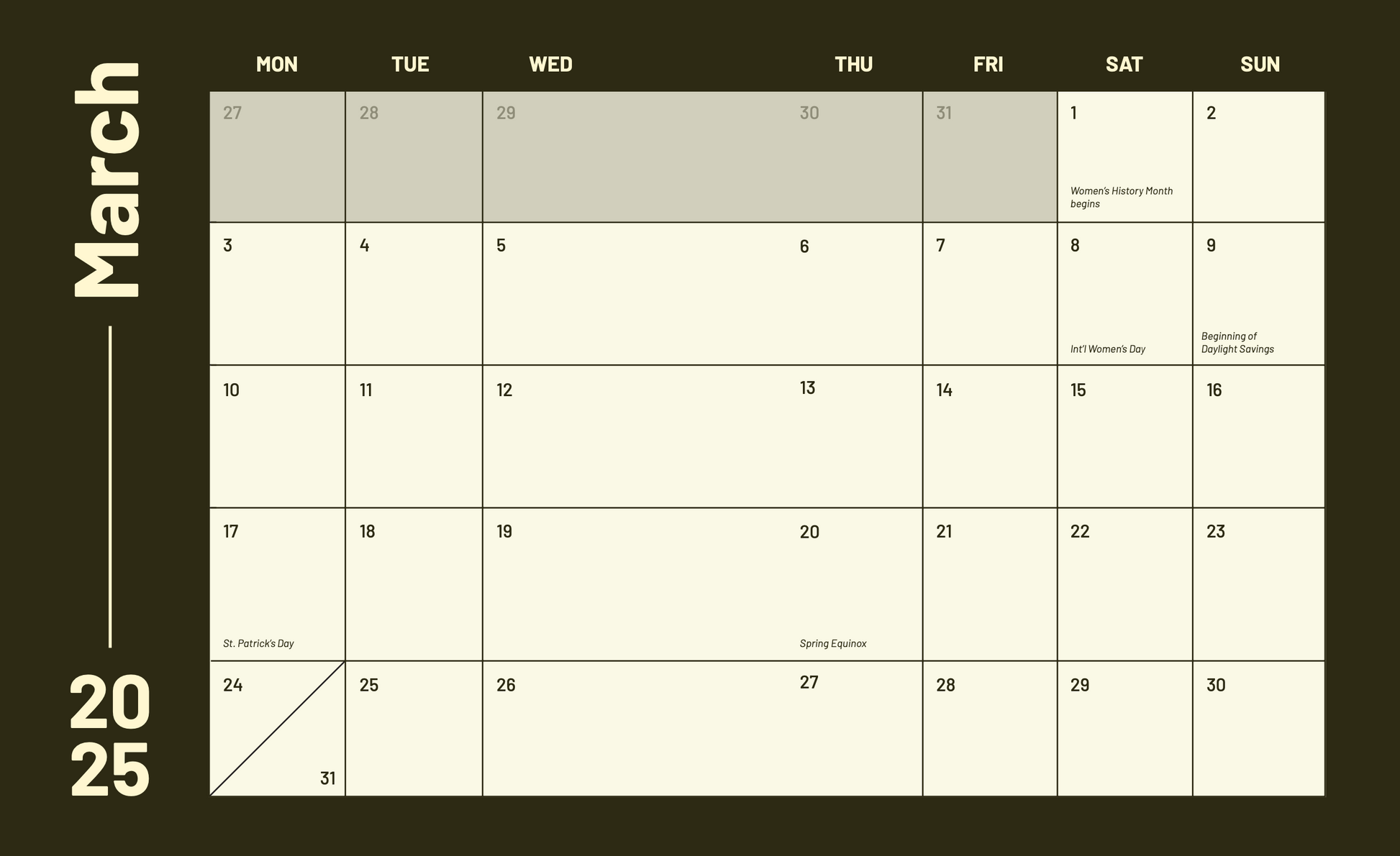 *Please note that there is a small typo on the full calendar page of March in the space before March 1st begins. This is usually just blank space but we wanted to let everyone know. Please see photo