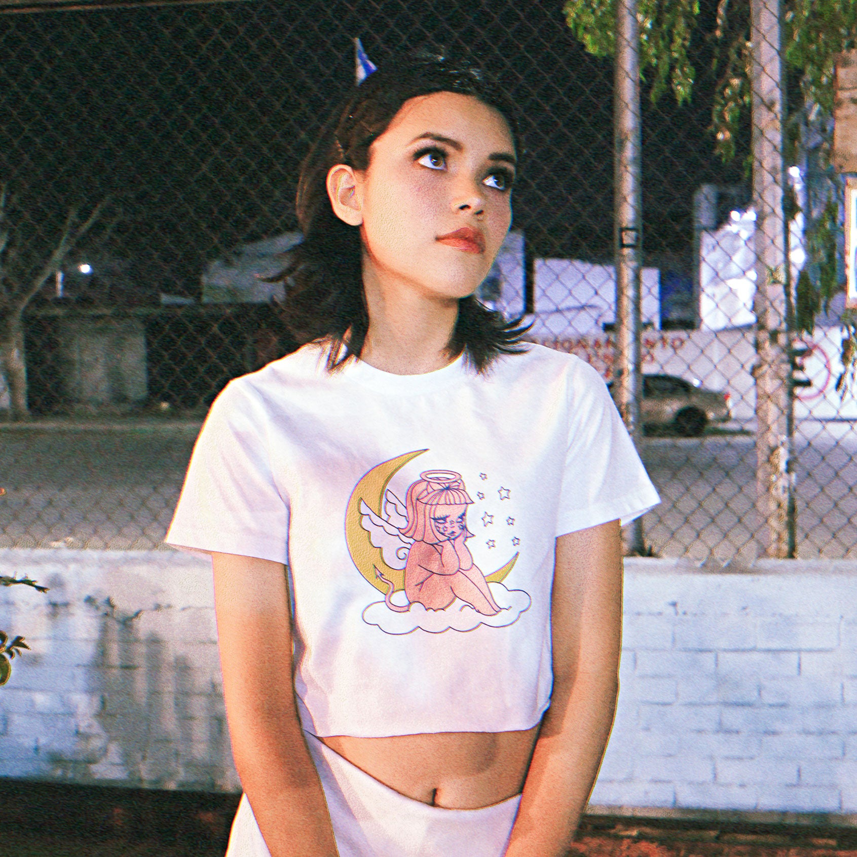 This white crop top tshirt features Valfré’s original artwork titled “Heavenly”.