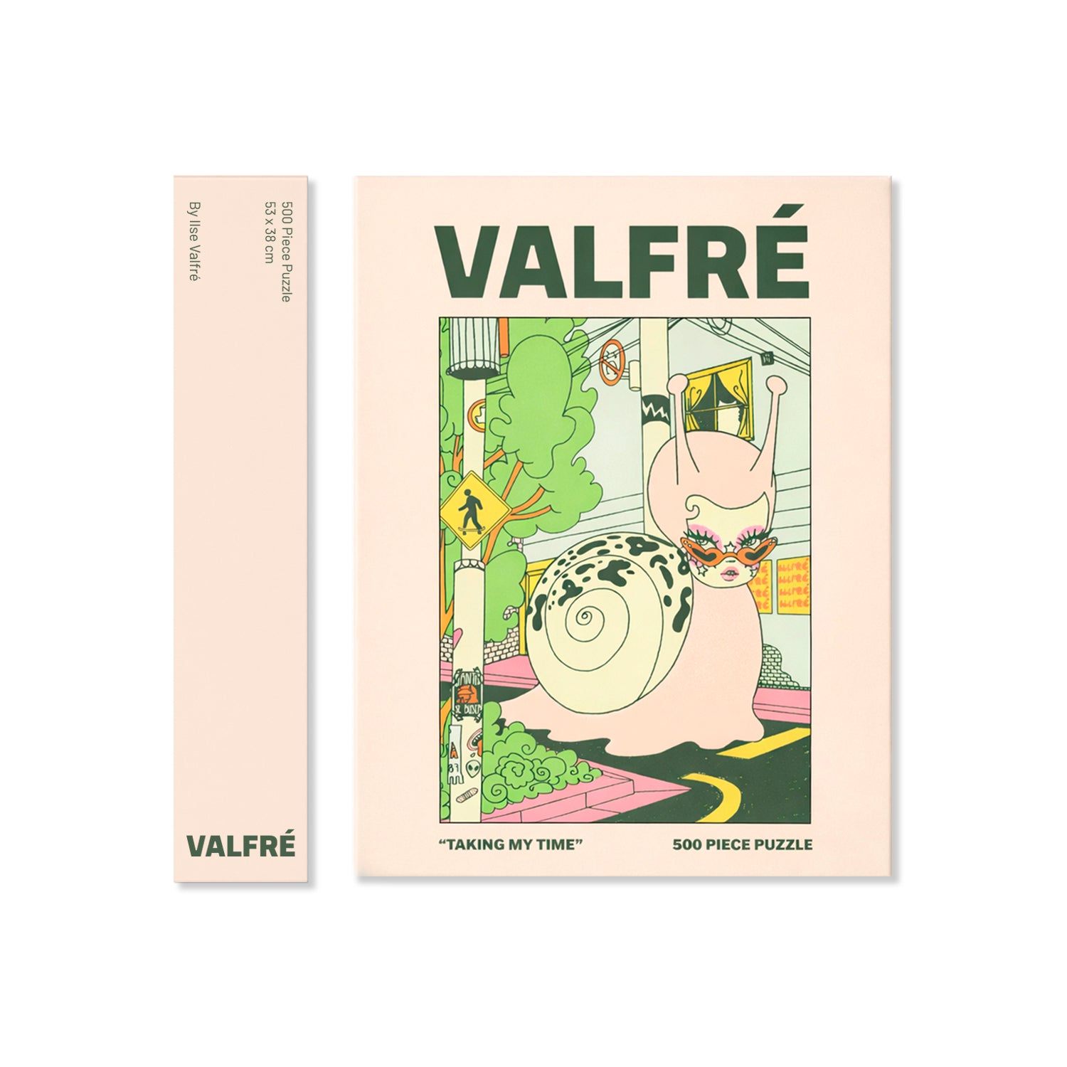 This 500 piece puzzle features Valfre's original artwork titled "Taking My Time"